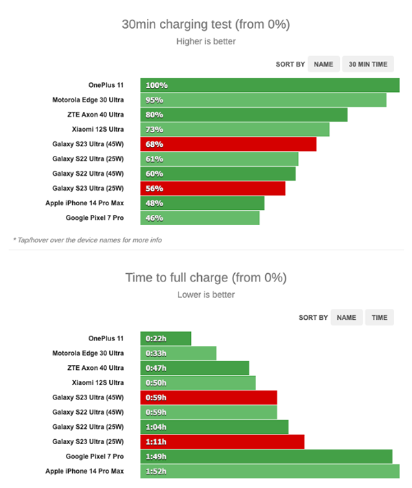 使用帶PPS(可編程電源)的45WUSBPD3.0充電器時,三星Galaxy S23 Ultra可在59分鐘內(nèi)充滿電。該數(shù)字與使用相同充電器的Galaxy S22 Ultra相似。而且只比小米12SUltra慢了9分鐘。蘋果和和谷歌同一細分市場中的手機充滿電所需的時間要長得多。