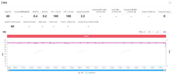 王者榮耀手游在開啟極致畫質(zhì)+超高分辨率下,使用高幀率進(jìn)行測(cè)試,游戲中最高幀率可達(dá)到60FPS,經(jīng)過近20分鐘的團(tuán)戰(zhàn),游戲過程中畫面穩(wěn)如一條直線,幀率方差僅有0.2FPS,完美運(yùn)行。