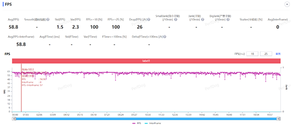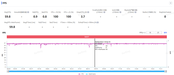 和平精英手游開啟HDR高清畫質(zhì)+極限幀率下,運(yùn)行近16分鐘的游戲,期間僅有微小幅度的掉幀,整體幀率穩(wěn)定在59.8FPS,方差僅有0.8FPS,游戲過程非常穩(wěn)定。
