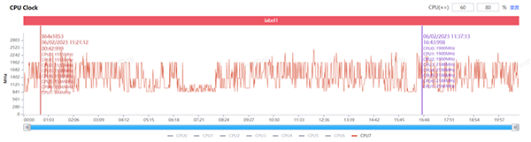 游戲過程中,三星Galaxy S23 Ultra對(duì)CPU的調(diào)度相對(duì)較為激進(jìn),3.36GHz的Cortex-X3大核最高可以開到滿頻,不過僅維持了1秒左右,平均開核頻率為1.41GHz。