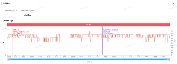 在GPU調(diào)度方面,平均頻率為308.2MHz。