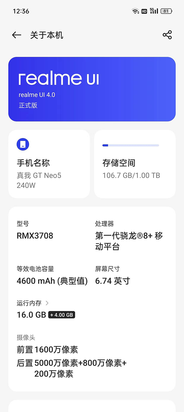 再者,240W版本的真我GT Neo5,還有16GB+1TB超大存儲組合,這個更不得了:16GB運存是目前智能手機的滿級運存了,而1TB也是目前智能手機的機身容量最大值了。這兩項組合在一起,直接讓真我GT Neo5吸引了眾人眼球。