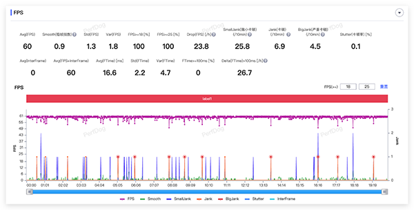 如下圖所示,一加Ace2平均幀率達(dá)到了60fps,穩(wěn)幀指數(shù)僅為0.9(越低越好,一般游戲類< 8):