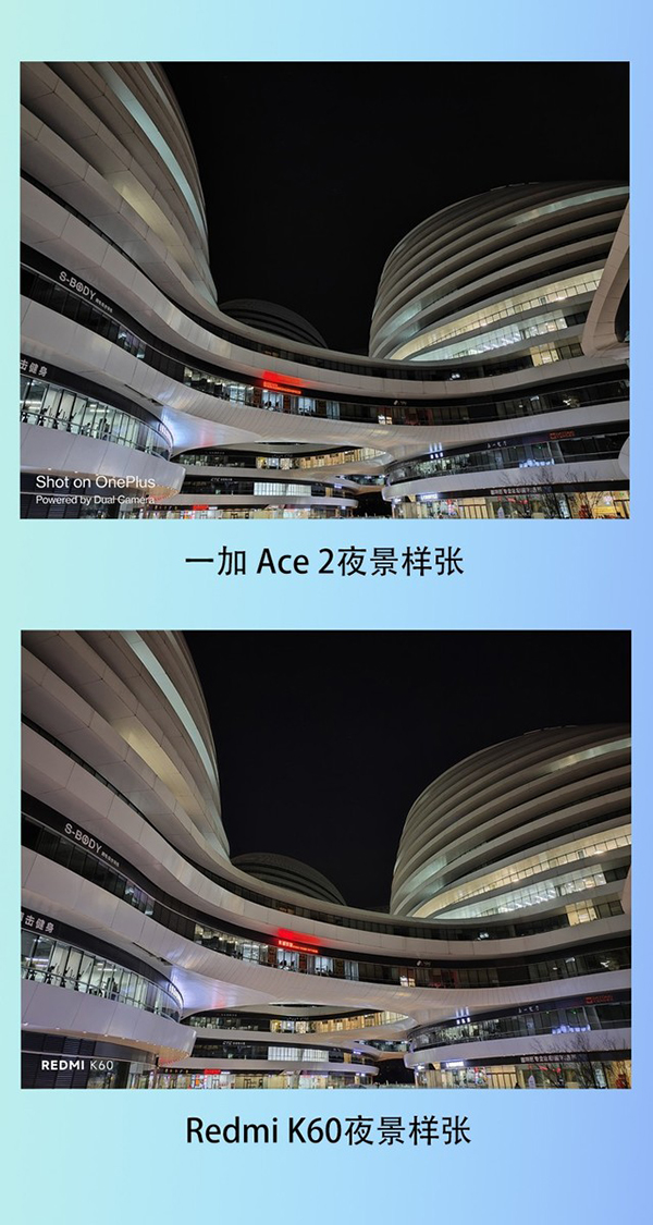 在夜景樣張中,一加Ace2在光線不充足的環(huán)境中,我們?nèi)匀豢梢缘玫揭粡埉?huà)面色彩優(yōu)秀的照片。在細(xì)節(jié)方面,一加Ace2幾乎捕捉到了建筑的全部細(xì)節(jié),這足以正面這枚5000萬(wàn)像素IMX890大底主攝強(qiáng)大的解析能力,畫(huà)面中也沒(méi)有出現(xiàn)肉眼可見(jiàn)的噪點(diǎn),畫(huà)面清晰度非常高。而Redmi K60在夜景中的表現(xiàn)也非常不錯(cuò),純凈的天空給我?guī)?lái)了不錯(cuò)的印象,天空該黑的地方黑,建筑該亮的地方亮,天空通透物體周?chē)鷽](méi)有多余的光影,展現(xiàn)了HDR強(qiáng)大的能力。