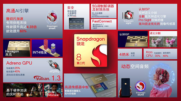 在全新架構(gòu)的加持下,特別是4枚性能內(nèi)核的引入,讓全新KryoCPU在性能上相比驍龍8Gen1提升35%,同時(shí)能效提高達(dá)40%。