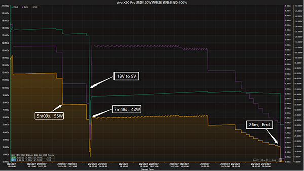 將手機(jī)電量耗盡后,將vivo X90 Pro與原裝120W充電器放置于25℃恒溫箱中,接通電源,并使用POWER-ZKM003C記錄數(shù)據(jù),測試數(shù)據(jù)如下。