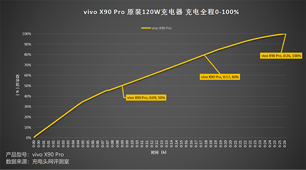 繪制折線圖,可以看出使用原裝120W充電器為vivo X90 Pro充電50%耗時9分鐘,充電至80%耗時17分鐘,充至100%耗時26分鐘。