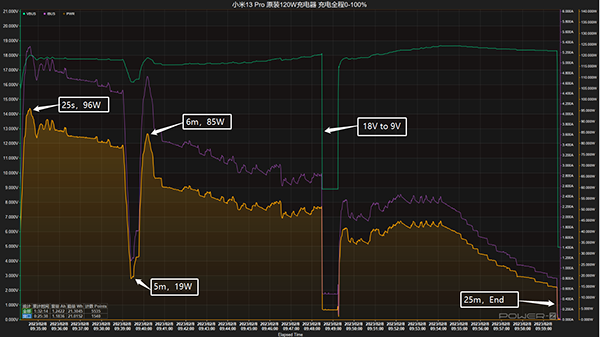 接通電源握手18V電壓檔位,充電25秒后功率攀升至96W左右,隨后功率逐漸下降,至5分鐘19秒功率下降至18W左右,接著再次攀升,第6分鐘功率攀升至85W左右,之后功率再次下降;第14分鐘握手9V電壓檔位,并持續(xù)充電一分鐘后再次握手18V電壓檔位;第20分鐘,功率開始下降,直至手機(jī)充滿電,充電全程耗時(shí)約25分鐘。