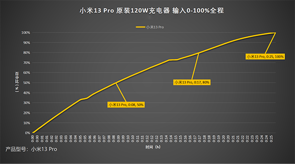 繪制出折線圖,可以看出使用120W原裝充電器,充至50%耗時(shí)8分鐘,充至80%耗時(shí)17分鐘,充至100%則需要25分鐘左右。