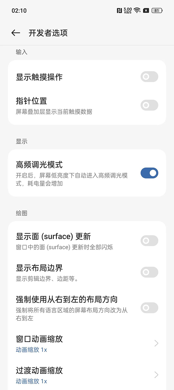 對(duì)于現(xiàn)在手機(jī)屏幕來(lái)說(shuō),支持高頻PWM調(diào)光也是屢見(jiàn)不鮮了,尤其是在旗艦機(jī)型了,這個(gè)高頻PWM調(diào)光幾首就是標(biāo)配了,因此很多人在購(gòu)機(jī)的時(shí)候也會(huì)看手機(jī)是不是支持高頻PWM調(diào)光,可以這個(gè)功能帶來(lái)的視覺(jué)體驗(yàn)方面的影響了,像這次的一加Ace2在這個(gè)屏幕方面也是支持高頻PWM調(diào)光的,這一點(diǎn)大家可以放心,不過(guò)在默認(rèn)狀態(tài)下是沒(méi)有激活的,需要手機(jī)激活這之后才能開(kāi)啟使用,這個(gè)開(kāi)啟使用也是比較簡(jiǎn)單的,多次點(diǎn)擊系統(tǒng)版本號(hào)激活開(kāi)發(fā)者模式,在開(kāi)發(fā)者模式中打開(kāi)就可以使用了,非常的簡(jiǎn)單和方便,其中開(kāi)啟之后,低亮度為高頻PWM調(diào)光,中高亮度是低頻PWM調(diào)光,不開(kāi)啟還是全亮度低頻PWM調(diào)光。