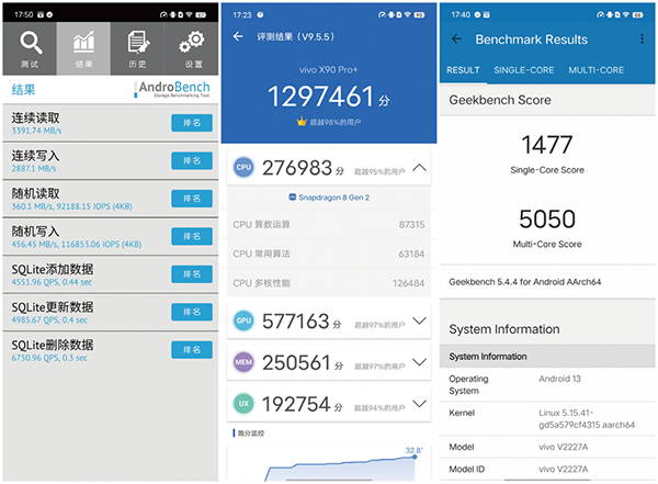 在跑分測試中,vivo X90 Pro+的“鐵三角”組合性能表現(xiàn)相比上一代旗艦機也有了巨大提升:在《安兔兔評測》中,得分為1297461;在Geekbench 5中,單核成績?yōu)?477,多核成績?yōu)?050;在AndroBench中,連續(xù)讀寫速度分別高達3391.74MB/s和2887.1MB/s,相比USF3.1的成績,幾乎實現(xiàn)了性能翻倍。