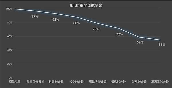 續(xù)航方面,我們使用在線5小時(shí)重度續(xù)航測(cè)試模型,對(duì)一加Ace2進(jìn)行續(xù)航測(cè)試: