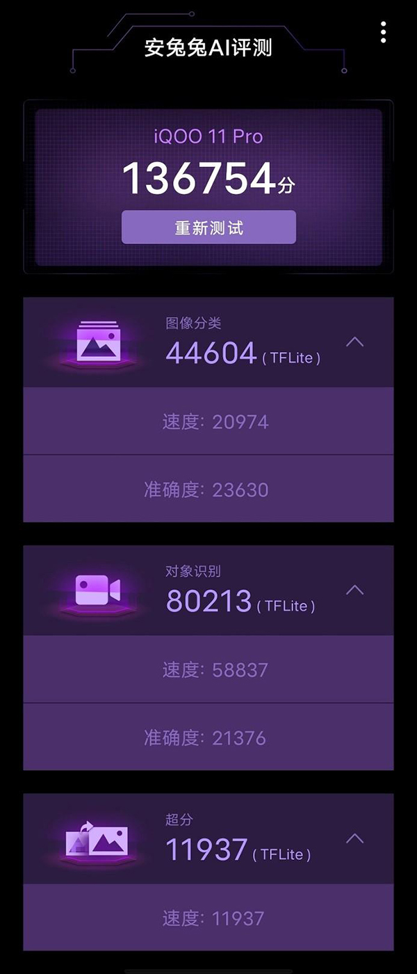 新一代驍龍芯片還為手機(jī)帶來(lái)強(qiáng)大的AI算力。在安兔兔AI評(píng)測(cè)中,iQOO 11 Pro獲得了13754分,圖像分類(lèi)、圖像識(shí)別、超分三項(xiàng)子項(xiàng)測(cè)試中分別獲得44604、80213、11937分。綜合來(lái)看,這款手機(jī)在圖像識(shí)別測(cè)試項(xiàng)目中有突出的表現(xiàn),擁有快速的焦點(diǎn)捕捉能力以及穩(wěn)定的持續(xù)跟焦能力,在拍攝過(guò)程中實(shí)現(xiàn)快速、精準(zhǔn)、持續(xù)地捕捉拍攝對(duì)象。