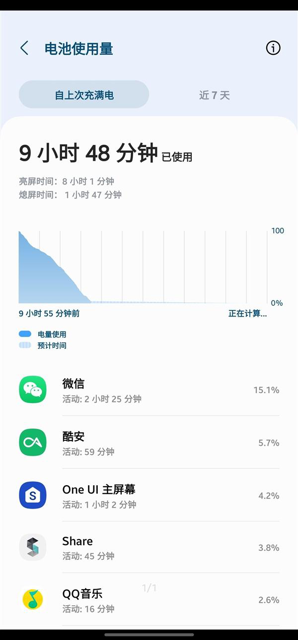如圖所示,Galaxy S23 Ultra使用時間是9小時48分鐘,其中亮屏?xí)r間是8小時1分鐘,熄屏?xí)r間是1小時47分鐘,剩余電量是3%。在使用過程中,Galaxy S23 Ultra是全程2K分辨率、120Hz高刷,一半時間是5G網(wǎng)絡(luò)狀態(tài)下,一半時間是WiFi狀態(tài)下,未開啟省電模式。