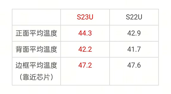 半小時(shí)過后的溫度,S23 Ultra的正面僅有44.3度,背面42.2度,邊框則達(dá)到了47.2度,也是比較燙的,但是從之前的不能玩到現(xiàn)在的勉強(qiáng)能玩,進(jìn)步還是蠻大的嘛。但跟國(guó)內(nèi)這些安卓廠商來比,這些國(guó)外大廠的散熱和性能調(diào)校,還是要加加油??!