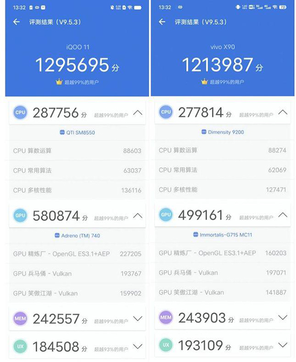 可以看見iQOO 11和自家的旗艦中杯X90標準版相比,CPU多核跑分、GPU的跑分優(yōu)勢巨大,也基本和前面幾個跑分工具的結(jié)果相印證,不過從跑分結(jié)果看,iQOO 11的UX跑分有些略低。