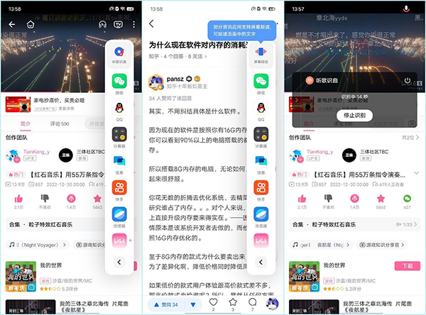 對(duì)了,智能側(cè)邊欄也終于可以智能聽歌識(shí)曲(但是目前僅支持i音樂),朗讀微信文章。但是目前在邏輯方面還有些欠缺,例如我在微信看視頻號(hào),它仍然只支持朗讀文章的功能。