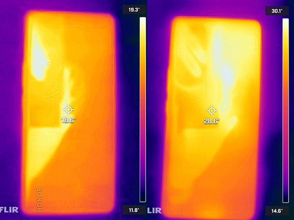 玩一小時(shí)120幀《王者榮耀》后,機(jī)身最高溫度從19.3攝氏度上升到30.1攝氏度,上升了10.8攝氏度,最高溫度區(qū)域主要在鏡頭組右側(cè)。這個(gè)升溫并不高,溫度控制很不錯(cuò)。