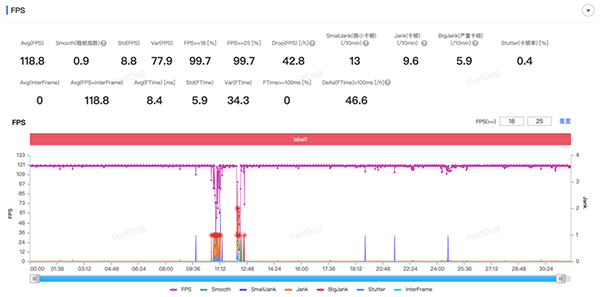 首先是《王者榮耀》,將努比亞Z50的游戲圖像調整為極高(120幀)+極致畫質,實測前機身正面溫度與機身背面溫度均為23度。半小時測試下來平均幀率為118.8幀,中間掉幀位置為一局游戲結束后重新開局的準備環(huán)節(jié)??梢钥吹綆蕡D幾乎是一條直線,在第二局的中后段爆發(fā)了一場8人團戰(zhàn),畫面有些許的掉幀,但不影響整體的游戲體驗。
