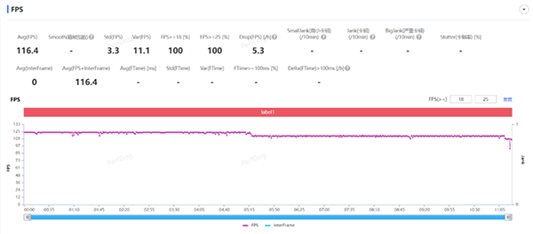 王者榮耀手游在開啟極高幀率與超高分辨率下,游戲以120FPS運行,前5分鐘游戲可穩(wěn)定在最高幀率,到了5分鐘左右,游戲降至114FPS運行,估計是為了控制溫度,最終平均幀率維持在116.4FPS。