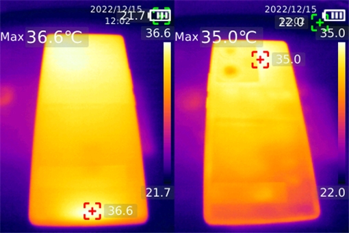 溫度方面,機身正面最高溫度36.6攝氏度,位于機身底部,背面最高溫度35攝氏度,位于相機模組右方,雙手握持不會感到特別熱。