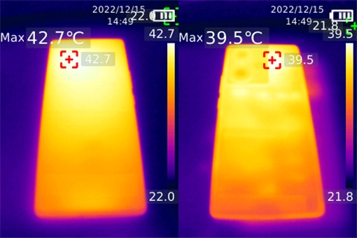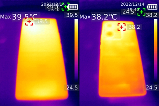 經(jīng)過溫度測試,機身正面最高溫度42.7攝氏度,機身背面最高溫度39.5攝氏度,當游戲進行到15分鐘左右時會感覺明顯的燙手,必須要改變握持部位才能夠繼續(xù)游戲。