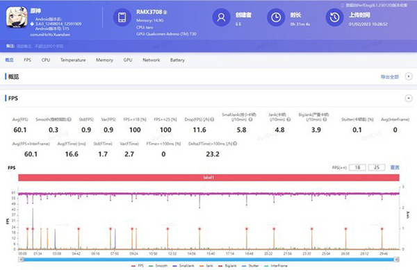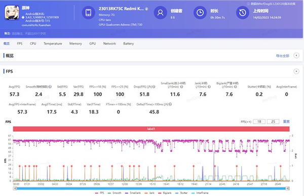 在《原神》蒙德跑圖中,真我GT Neo5半小時(shí)平均幀率達(dá)到了60.1幀,整體來看都較為平穩(wěn),如果只是隨便跑跑大世界,壓力并不會(huì)很大。紅米K60半小時(shí)平均幀率也達(dá)到了57.3幀,但后半程波動(dòng)較大,在打怪、快速奔跑、滑翔等場(chǎng)景下不可避免出現(xiàn)了一些幀率下滑的情況。好在半個(gè)小時(shí)游戲下來,兩款手機(jī)都沒有出現(xiàn)降亮度、降分辨率的情況,這一點(diǎn)還是不錯(cuò)的。
