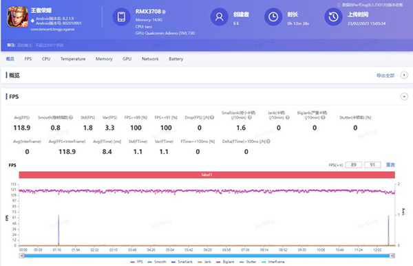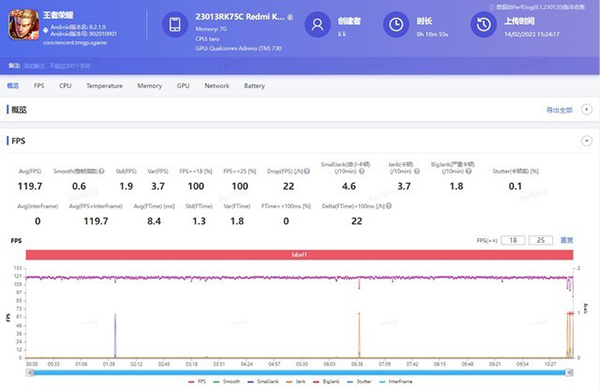 《王者榮耀》方面,兩款手機(jī)都支持120幀模式,真我GT Neo5平均幀率118.9 FPS,紅米K60平均幀率119.7 FPS,整體也都是比較平穩(wěn)的,高幀游戲體驗(yàn)十分出色。