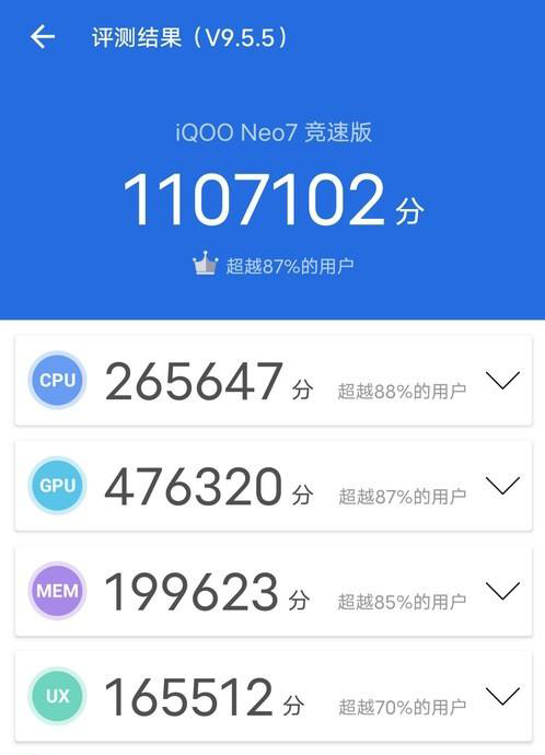 在這個性能配置方面,iQOO Neo7競速版搭載了新 一代驍龍8+旗艦處理器,其采用4nm制程,并采用1+3+4三叢集旗艦ARM V9架構(gòu),包括1顆3.2GHz Cortex X2超大性能核心,3顆2.75GHz Cortex A710性能核心以及4顆2.0GHz Cortex A510能效核心。并且還配備Adreno 730 GPU,相比第 一代驍龍8處理器,在相同功耗下CPU性能提升10%,GPU性能提升10%;相同性能下,功耗降低15%,有效改善游戲等場景下長時間性能釋放時的發(fā)熱與降頻問題。在安兔兔V9的性能測試中,iQOO Neo7競速版獲得了超過110萬分的好成績。