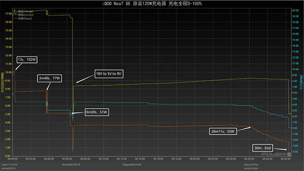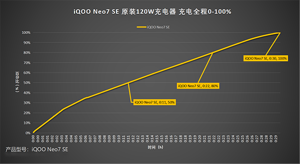 繪制出折線圖,可以看出使用原裝120W充電器為iQOO Neo7 SE充電50%耗時11分鐘,充電80%耗時22分鐘,充至100%耗時30分鐘。