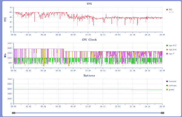 先來看看知名“跑分軟件”《原神》,最高畫質(zhì)(關(guān)閉動態(tài)模糊)下須彌跑圖+戰(zhàn)斗30分鐘,平均幀率為47幀,整體比較流暢,但在第9分鐘之后,幀率穩(wěn)步下降至40幀左右,而且機身的溫升也比較明顯。若有長時間游玩的需求,散熱背夾依舊是最佳的解決方案。