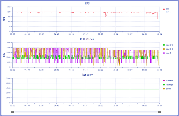而《王者榮耀》的負載就低很多了,極致畫質(zhì)+極高幀率進行一局匹配,平均幀率為118,幀率曲線幾乎平直,開團也沒有什么壓力。對于這種日常低負載游戲,iQOO Neo 7 SE顯然是從容應(yīng)對。