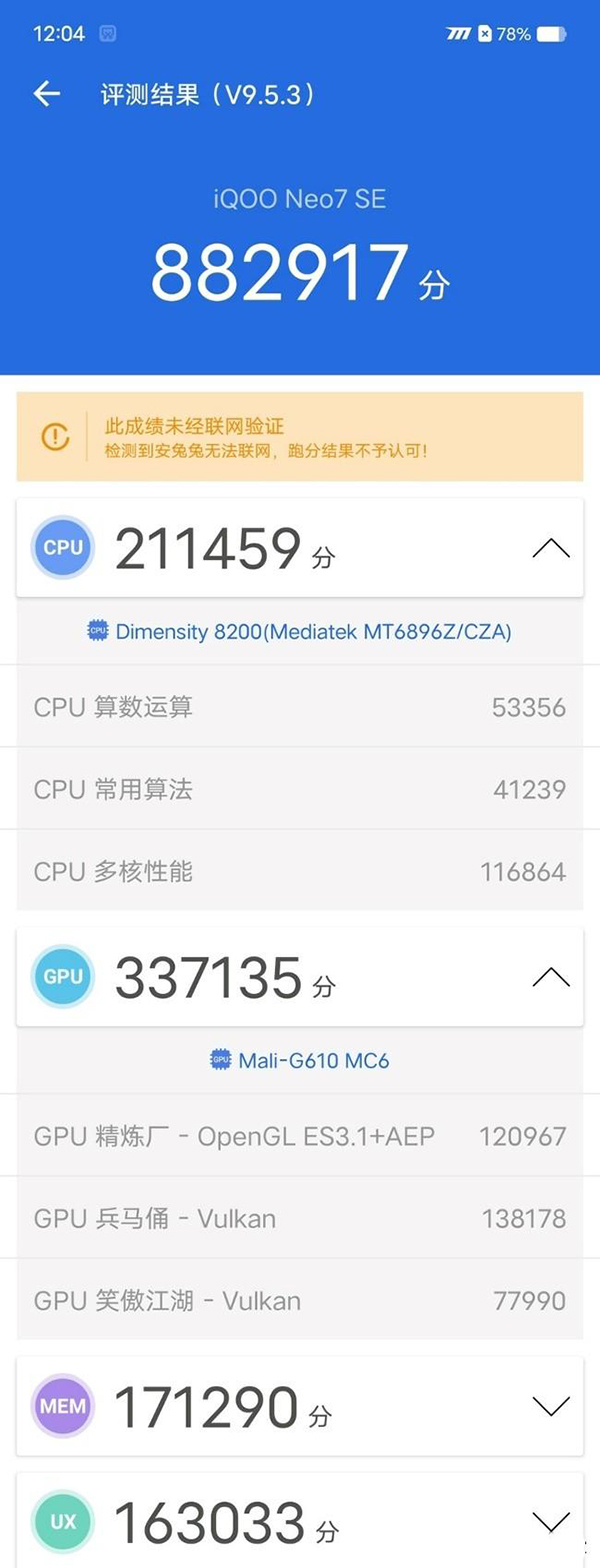 安兔兔V9.5,3版本實(shí)測(cè)總分達(dá)到了882917分,其中,CPU得分211459分,GPU得分337135分。得益于6400Mbps增強(qiáng)版LPDDR5和超頻版UFS 3.1的加入,MEM得分171290分。并且iQOONeo7 SE支持內(nèi)存融合3.0,將RAM和ROM通過算法進(jìn)行優(yōu)化融合,通過調(diào)用部分閑置ROM作為RAM運(yùn)行,達(dá)到擴(kuò)展運(yùn)存的效果。