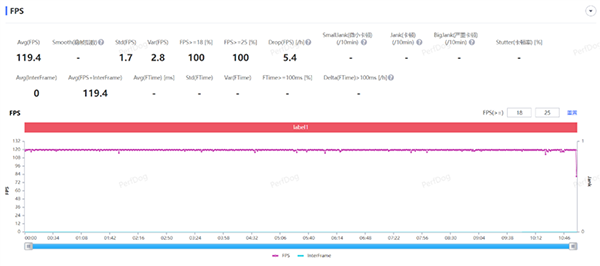 在較低負(fù)載的王者榮耀手游中,開(kāi)啟極高幀率+超高分辨率下,經(jīng)過(guò)一局團(tuán)戰(zhàn)近10分鐘的游戲,平均幀率達(dá)到119.4FPS,游戲中幀率非常穩(wěn)定,幾乎毫無(wú)波動(dòng),平均幀率方差達(dá)到2.8,也算是不錯(cuò)的水平。