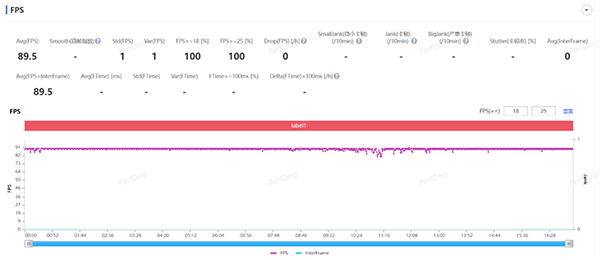 和平精英手游,在開(kāi)啟流暢畫(huà)質(zhì)下能夠保證在最高90幀運(yùn)行,經(jīng)過(guò)17分鐘的測(cè)試,期間出現(xiàn)過(guò)小幅度掉幀,最終平均幀率維持在了89.5FPS,接近滿幀運(yùn)行,平均方差為1。