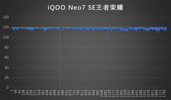 iQOO Neo7 SE經(jīng)過實(shí)測(cè),在《王者榮耀》120幀模式下,30分鐘的平均幀率為119幀,溫槍實(shí)測(cè)機(jī)身正面溫度為37.8℃,背面最高溫37.7℃
