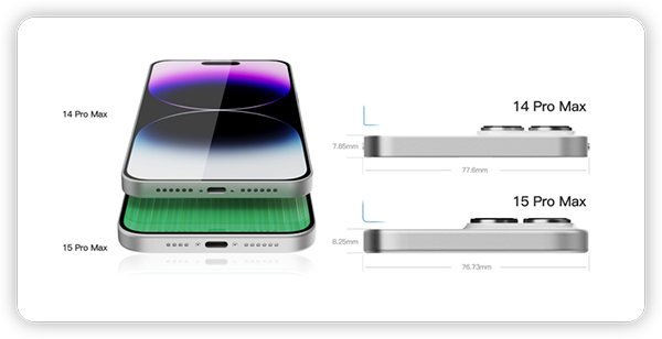 同時(shí),從機(jī)身厚來看,iPhone 15 Pro Max的厚度為8.86mm,比前代機(jī)型要厚大約0.4mm。
