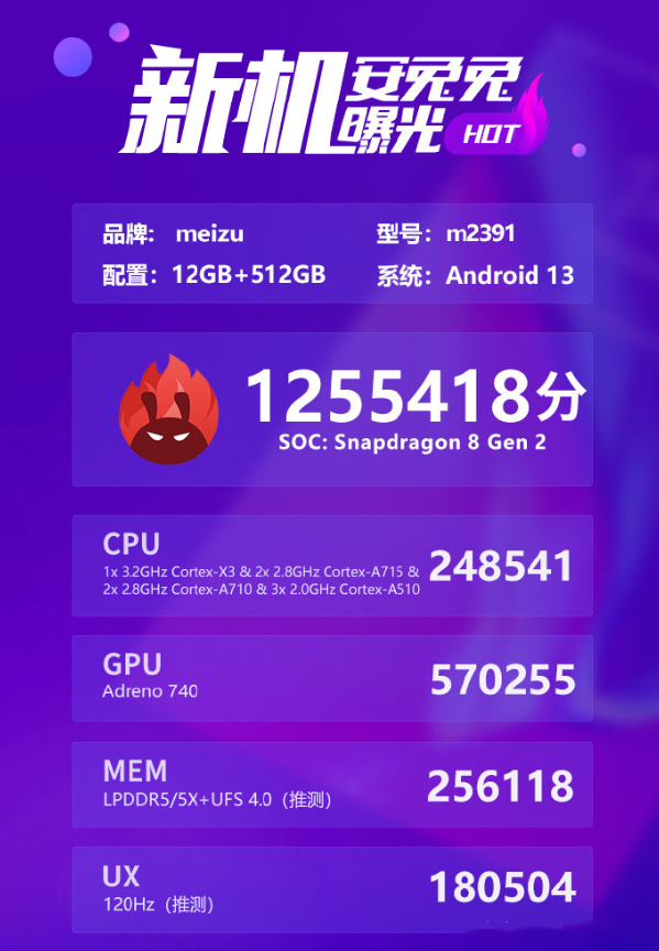 在這個硬件配置方面,魅族20搭載高通驍龍8Gen2移動平臺,同時配備LPDDR5X內存和UFS4.0閃存,是2023年旗艦機標配,安兔兔官方今天放出了魅族20的跑分。據介紹,該機型號為m2391,測試總分為1255418分。