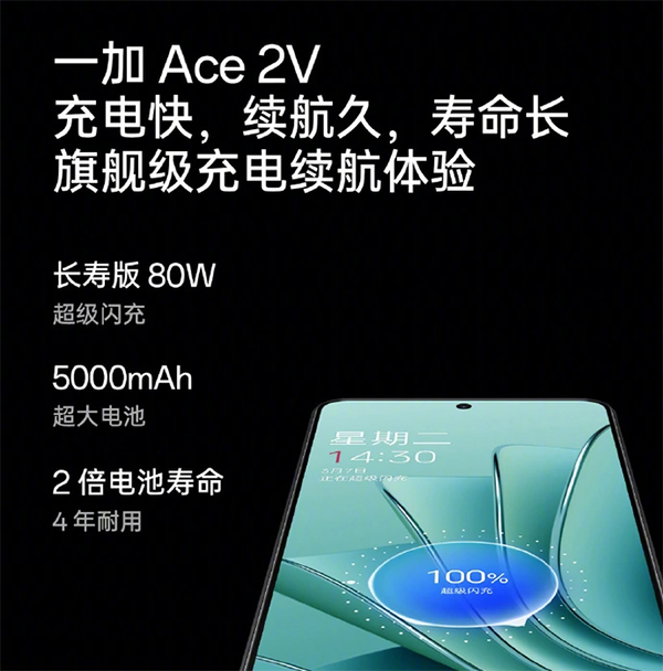 根據(jù)官方最新放出的信息,一加Ace2V將搭載長(zhǎng)壽版80W超級(jí)閃充。不僅如此,新機(jī)還會(huì)內(nèi)置5000mAh超大電池,這塊電池不僅容量大,而且壽命是普通電池的2倍,可以做到“4年耐用”。簡(jiǎn)單來(lái)說(shuō),一加Ace2V不僅充得快,續(xù)航久,而且壽命長(zhǎng)!