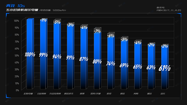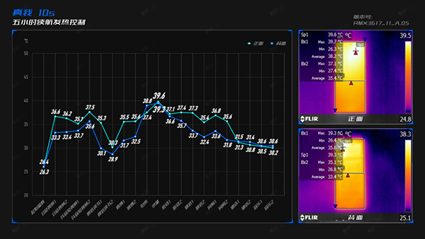 還是我們的「五小時(shí)續(xù)航測(cè)試」標(biāo)準(zhǔn),滿電的真我10s跑完全程剩余電量61%,表現(xiàn)尚可,其中「相機(jī)」項(xiàng)目的耗電最高,共計(jì)用掉了約7%的電量,且此過程也錄得整個(gè)續(xù)航過程的機(jī)身最高溫,正面39.6℃、背面39.3℃,全程未超40℃,還算冷靜。