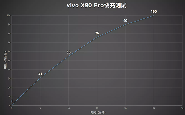 實測下來vivo X90 Pro的120W實際充電體驗下來只需要5分鐘就可以充入31%的電量,10分鐘55%的電量,充到100%的時間為25分鐘出頭。