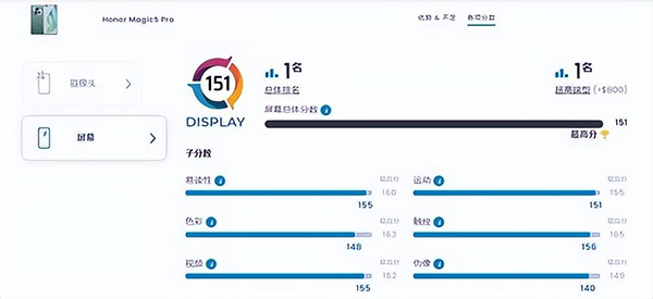 作為一款安卓高端旗艦手機,榮耀Magic5 Pro的屏幕表現(xiàn)自然也十分出色。在DXOMARK的專業(yè)測試中,榮耀Magic5 Pro的屏幕總分達到了151分,目前位列全球排行榜第一名。
