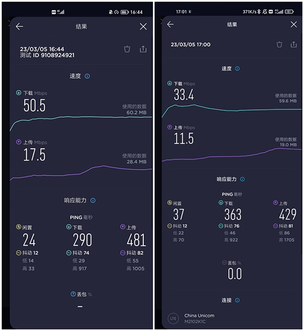 在電梯內(nèi),兩部手機(jī)都切換為4G信號(hào)滿(mǎn)格,左圖是榮耀Magic5 Pro的網(wǎng)速,平均下載速度達(dá)到50.3Mbps,右圖則是另一臺(tái)安卓手機(jī),平均下載速度卻僅有33.4Mbps,二者之間速度差了近1.5倍。