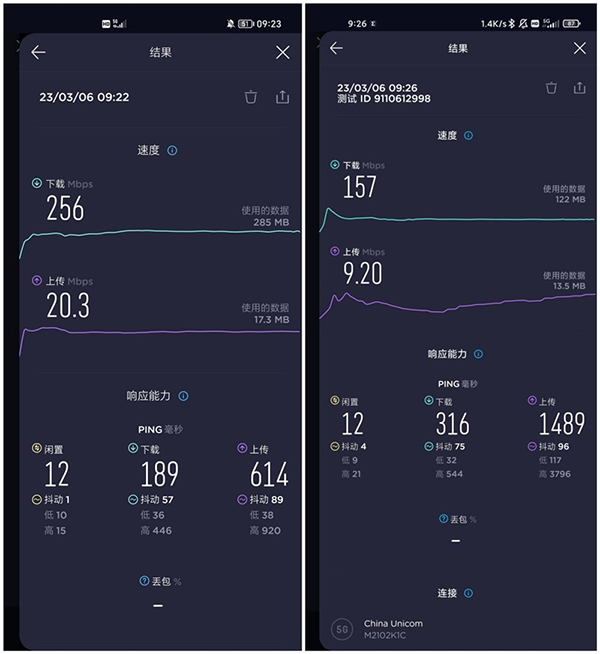 在地下車(chē)庫(kù)間,兩部手機(jī)都是5G信號(hào),左圖榮耀Magic5 Pro的網(wǎng)速直接飆到了256Mbps,上傳速度也達(dá)到了20.3Mbps,右圖的另一臺(tái)安卓手機(jī),平均下載速度卻僅有157Mbps,上傳速度僅有9.2Mbps,二者之間的下載速度差了近1.6倍,上傳速度也差了近2倍之多。
