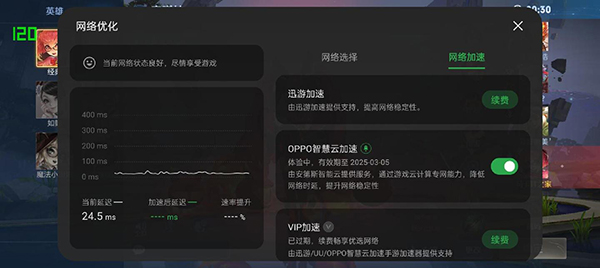 在游戲中,側(cè)邊欄呼出游戲助手,即可開啟“OPPO智慧云加速”功能,目前一加Ace2V可享受2年的免費(fèi)加速時(shí)間。