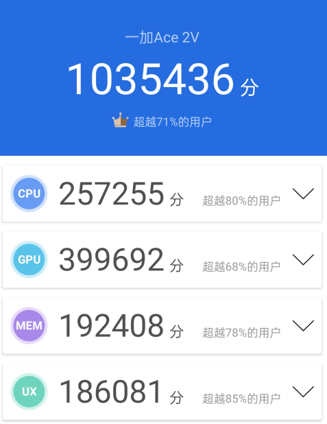 看下跑分,安兔兔分?jǐn)?shù)直接來(lái)到了103.5萬(wàn),相同價(jià)位常用的天璣8200,分?jǐn)?shù)大約在85萬(wàn)-88萬(wàn)左右,芯片不同分?jǐn)?shù)肯定會(huì)更高,所以在同價(jià)位中,Ace2V確實(shí)有優(yōu)勢(shì)。
