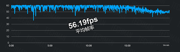 Redmi K50 Pro的表現(xiàn),要略遜一籌,平均幀率接近54幀。在前十分鐘,表現(xiàn)很好。但溫度上來(lái)之后,同樣開始降頻,但幀數(shù)波動(dòng)比較大。手機(jī)背面的溫度則是達(dá)到了47度左右。