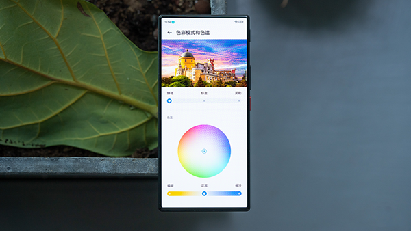色彩方面,還有努比亞傳統(tǒng)的默認(rèn)「鮮艷」,可選的「標(biāo)準(zhǔn)」和「柔和」三個色彩模式,且都支持色輪模式的色溫調(diào)節(jié),可自定義程度高——其中默認(rèn)的「鮮艷」模式默認(rèn)的白點色溫7769K,視覺上會稍稍偏冷;「標(biāo)準(zhǔn)」模式和「柔和」模式的默認(rèn)白點色溫風(fēng)格上則稍暖,分別測得6837K和6827K。