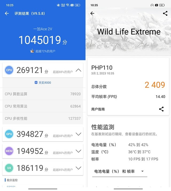 一加Ace2V這款手機采用的是天璣9000+LPDDR5x+UFS3.1性能組合,安兔兔跑分成績?yōu)?045019分,在在3DMark測試中,一加Ace2V的測試成績?yōu)?409分,性能表現(xiàn)還是十分優(yōu)秀的。整體表現(xiàn)算是非常不錯的了,完全是能夠滿足廣大消費者在各種場景使用手機的需求的。