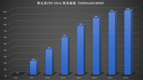 現(xiàn)在的手機電池的充電功率是越來越大的,大功率的充電會帶來高效的充電速率了,不過這次的努比亞Z50 Ultra并沒有配置超大功率的充電,這個手機的充電功率只有80W快充,看著并不大,不過實際的充電速度還是可以的,根據(jù)測試,把這個手機的內(nèi)置的5000mAh容量的電池充滿只需要34分鐘即可,這個充電速度還可以,算是正常的充電水準(zhǔn)了。